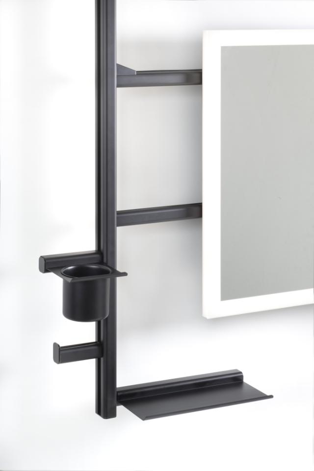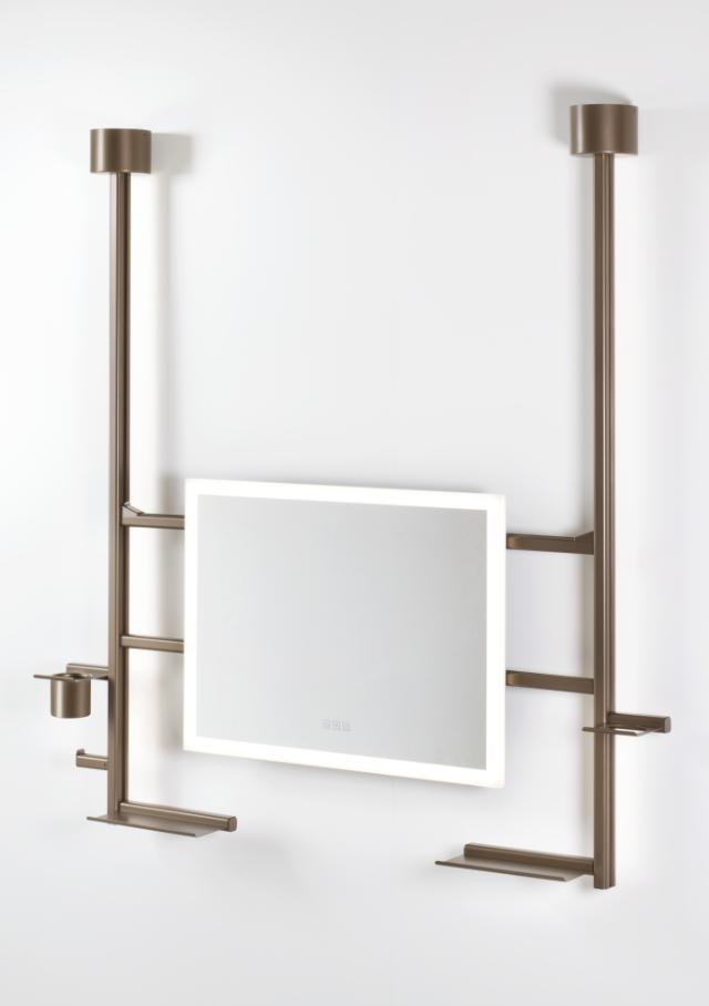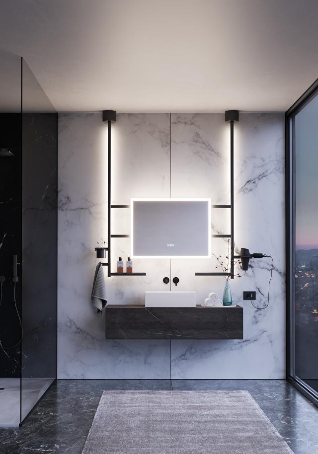 Et elegant og modulært LED-spejl med integreret D‑Motion-lys langs en lodret profil, der kombinerer belysning og opbevaring i et enkelt, stilrent badeværelseselement.