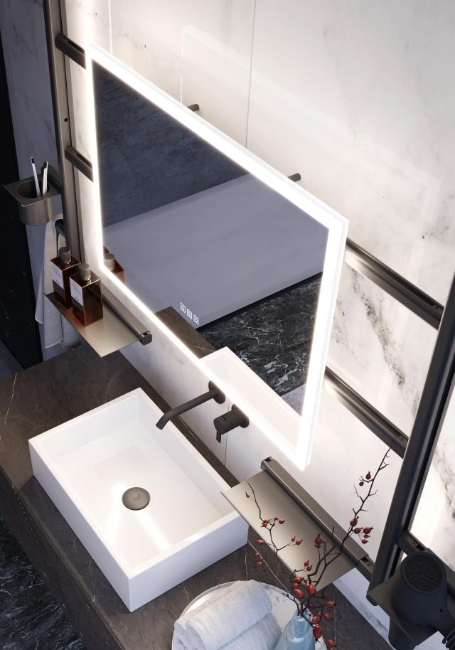 Et stilrent LED-spejl med indbygget hyldesystem, justerbar farvetemperatur og antidug-funktion – ideelt til moderne badeværelsesmiljøer med fokus på funktionalitet og design.