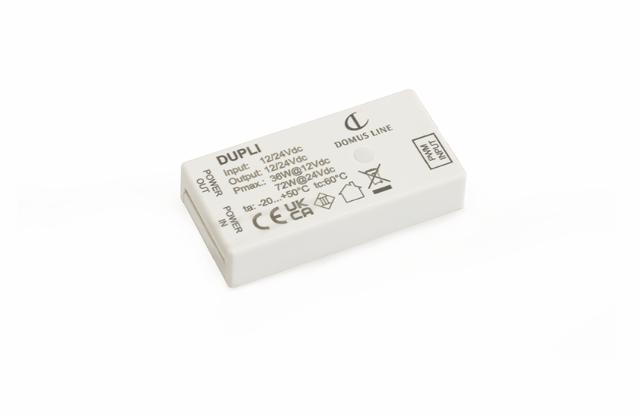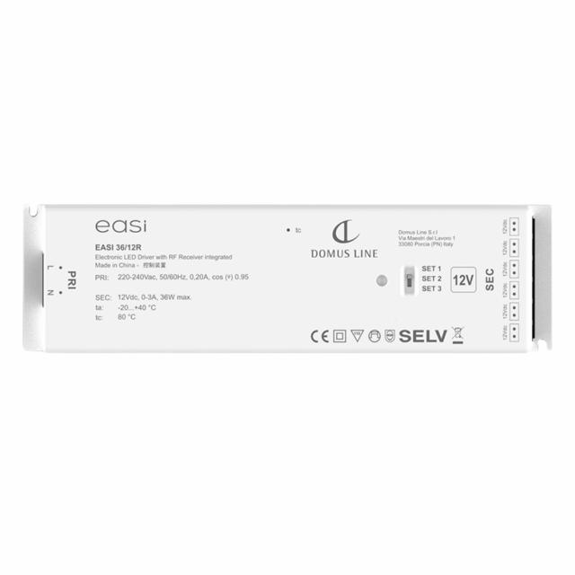EASI trådløs driver fra Domus Line er en smart LED-strømforsyning (12 V eller 24 V) med trådløs styring via EASI DISK, der tillader op til tre lysgrupper at blive tændt, dæmpet og justeret inden for en rækkevidde på 15 m.