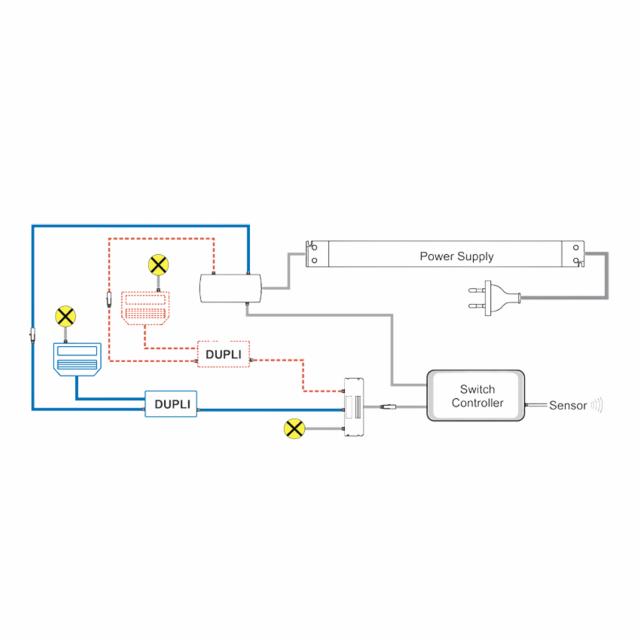 DUPLI er en signaldeler, der udvider D-Motion-styring til flere armaturer og strømforsyninger via én controller.