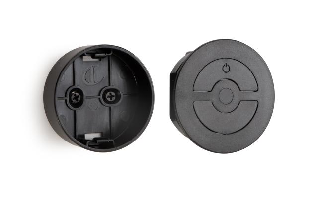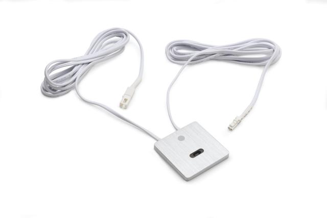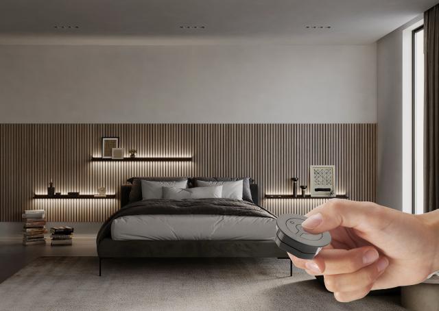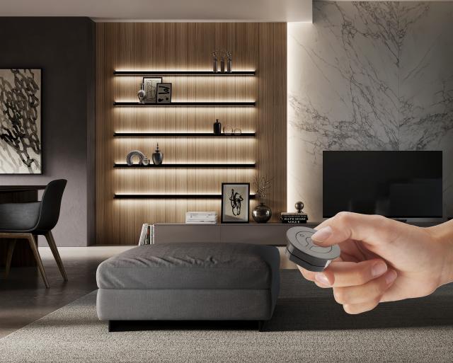 Et trådløst D‑Motion styringssystem fra Domus Line bestående af en fjernbetjening og modtagerenhed, der muliggør on/off, dæmpning og farvetemperaturjustering af LED‑lys – kan styre op til 6 moduler og op til 4 controllere kan betjene samme system.
