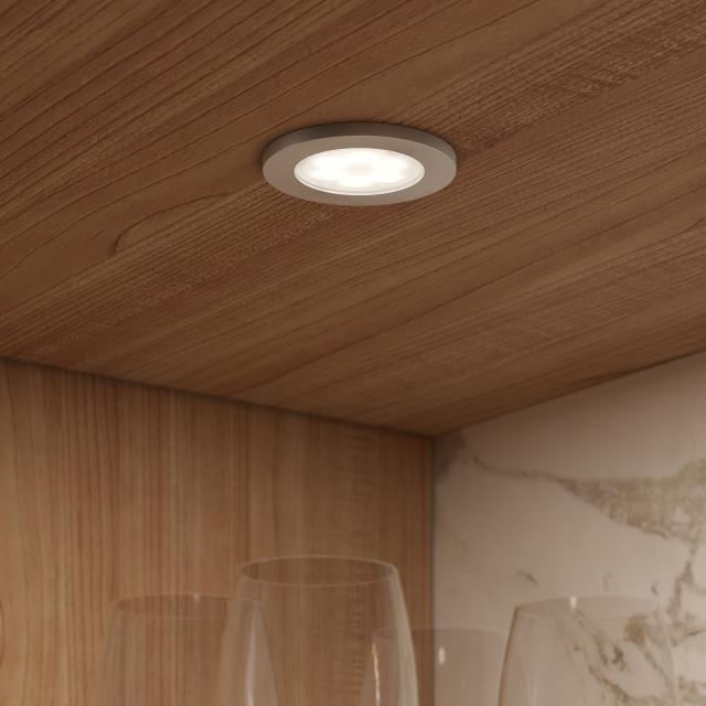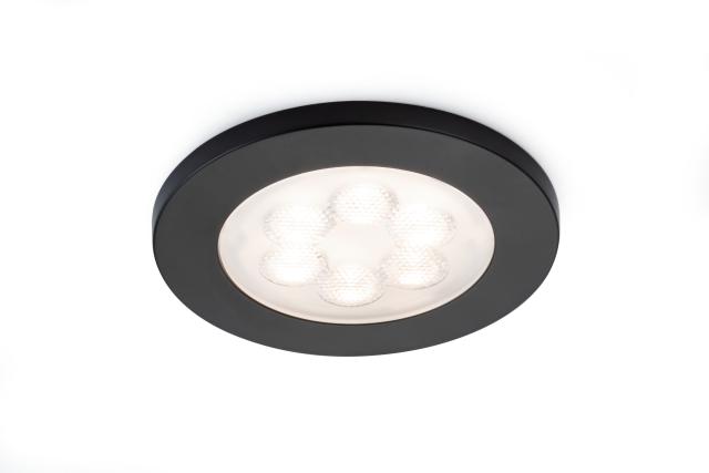Et kompakt, indfældet LED-spot med udskiftelige metalrammer i satin nickel eller sort – ideel til stilfuld, diskret accentbelysning.