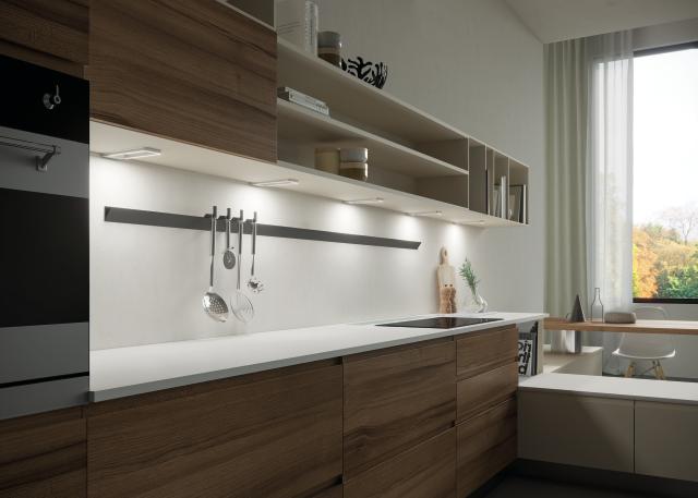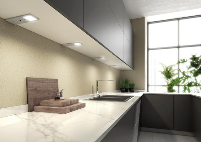 En ultratynd og elegant LED-armatur (blot 4 mm diffuser) til overflademontering, der leverer ensartet, blændfri lys – ideel under skabe eller hylder med diskret touch-dæmpning.
