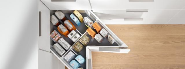 SPACE CORNER fra Blum forvandler ellers spildt hjørneplads til effektiv opbevaring med fuldt udtrækkelige skuffer.