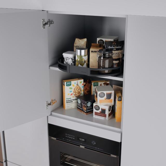 TurnMotion III fra Kesseböhmer kombinerer udtræk og 360° drejefunktion i ét elegant system til højskabe.