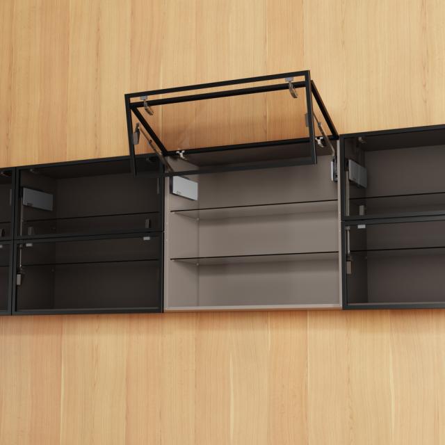Usynlig elegance; selv ved glasfronter – det integrerede klapbeslag forbliver usynligt, i lukket tilstand. Ved åbning, fremstår de synlige dele af AVENTOS HKi i elegant onyx-sort.