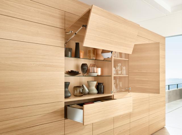 AVENTOS HS top klaplågebeslag i overskabet giver en følelse af vægtløshed: Store hele fronter kan nemt bevæges, og adgangen til varerne forbliver til enhver tid. Dermed realiseres også usædvanlige designvarianter som rammer eller vanger.
