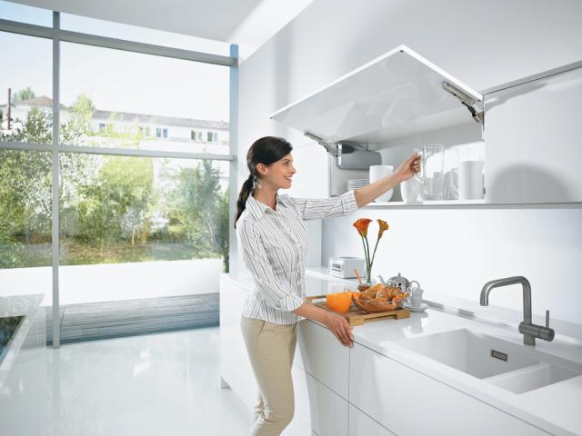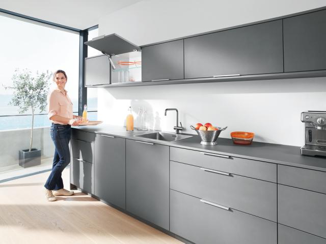 BLUMOTION sørger for stille og rolig lukning. Også kombinerbar med SERVO-DRIVE, det elektriske bevægelsessystem - enten til hele køkkenet eller som enkeltløsning. Med TIP-ON kan grebsløse klaplåger åbnes mekanisk.