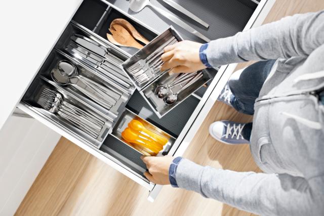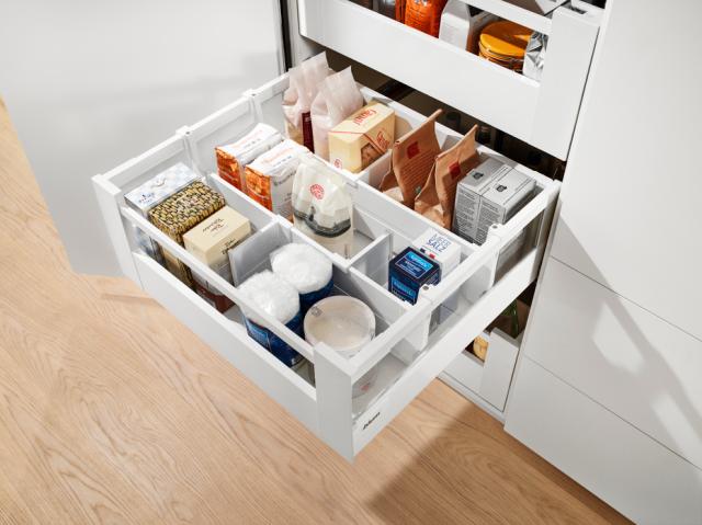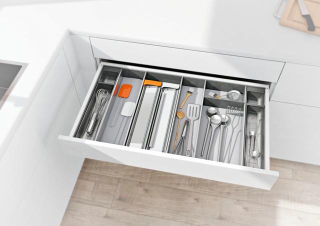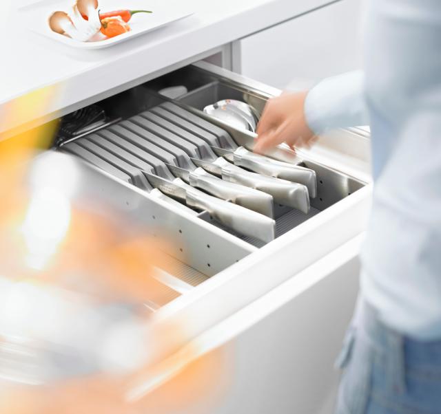 Det værdifulde inddelingssystem, skaber orden i enhver skuffe eller ethvert frontudtræk. Om det er spisebestik, flasker eller gryder, samtlige varer opbevares sikkert og bekvemt. Indret pladsen overskueligt og efter behov.